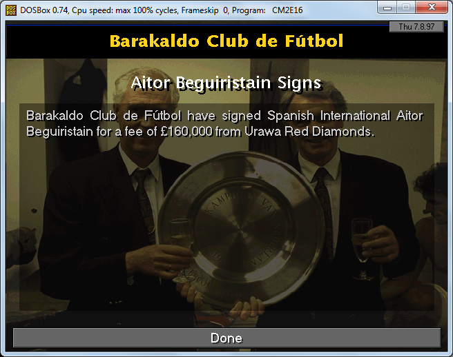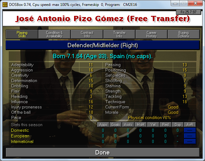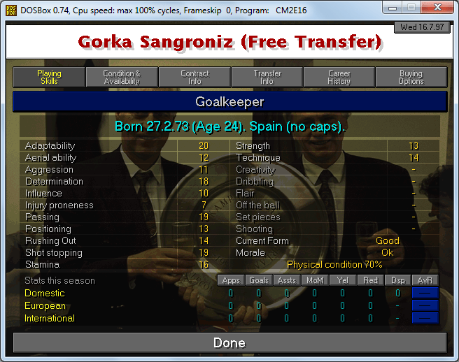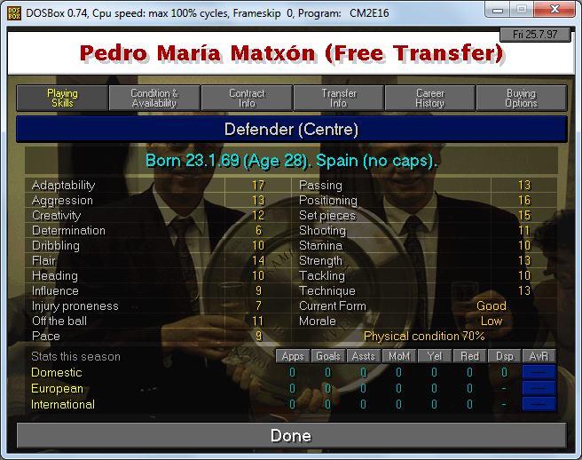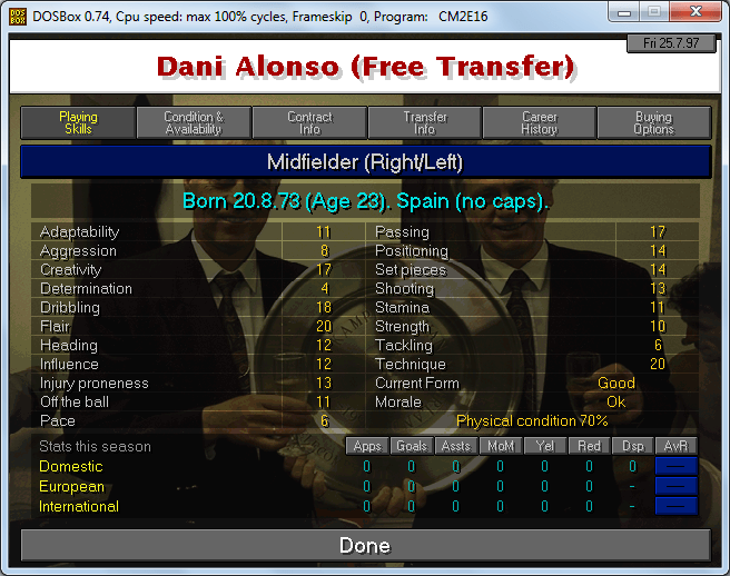 A quick glance at the Players Released screen showed that this lad (brother of Rafael Alkorta) had been released from Athletic B (the Athletic Bilbao youth team). Capable of playing two positions, he’ll surely find a place with us. I’ll bid for him