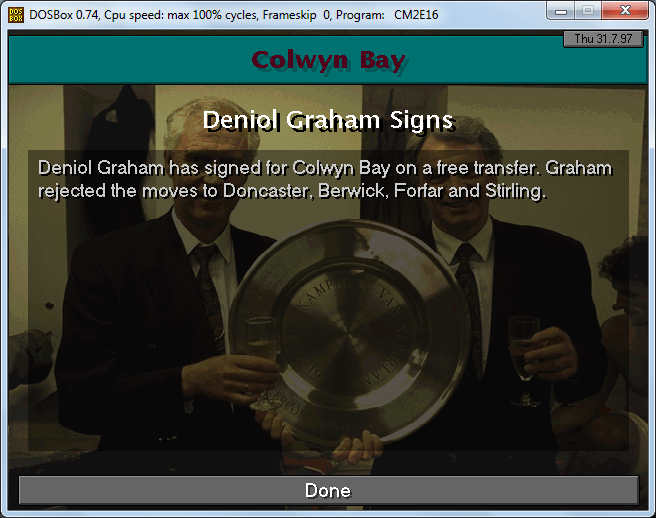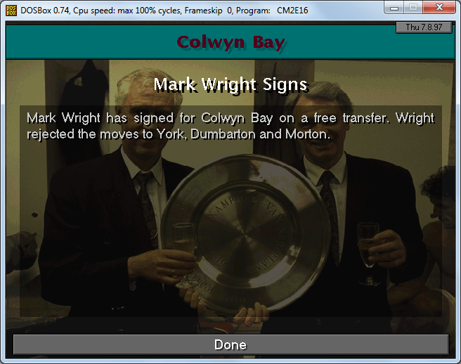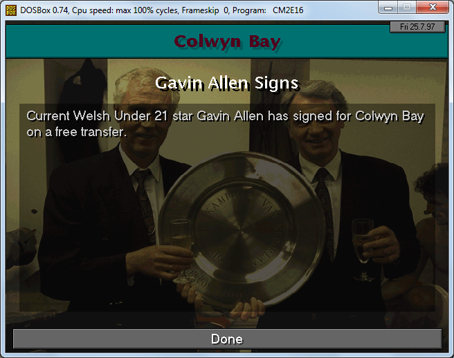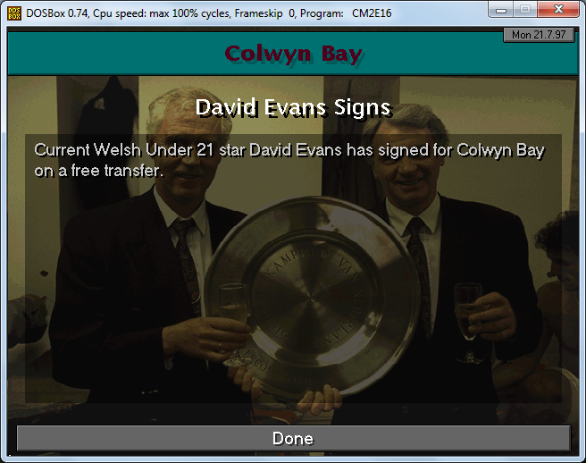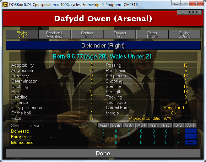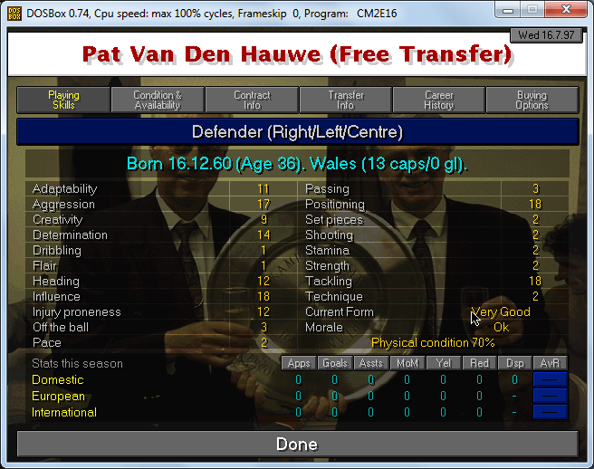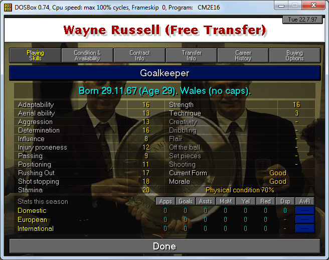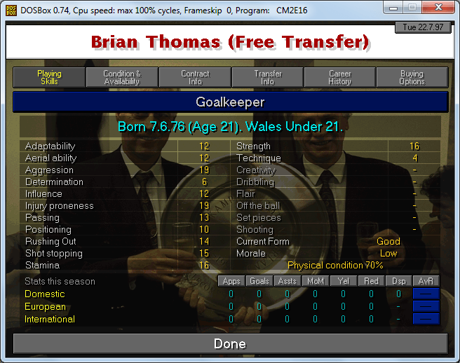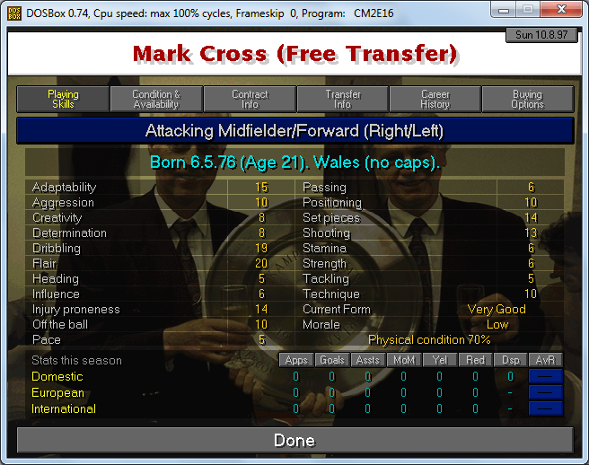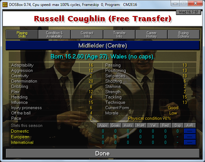 We only have a budget of 100 k, so signings will esentially be free transfer for the time being. We’ll need a little bit of a mix between Welsh and non-Welsh players to avoid having to play with “grey” players in the event we have players called up by the U-21 or the Wales national team. Bearing that in mind, let’s hit the transfer market.