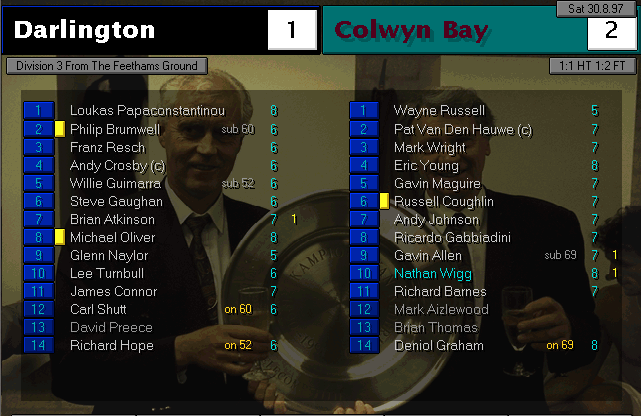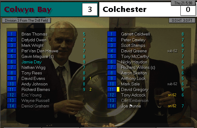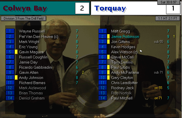 Dayfdd Owen for Darren Davies. Jamie Day for Rusell Coughlin. Mark Aizlewood as a sub. Marc Williams for Gavin Maguire. Wayne Russell for Brian Thomas.
