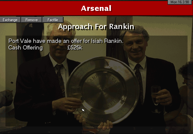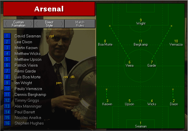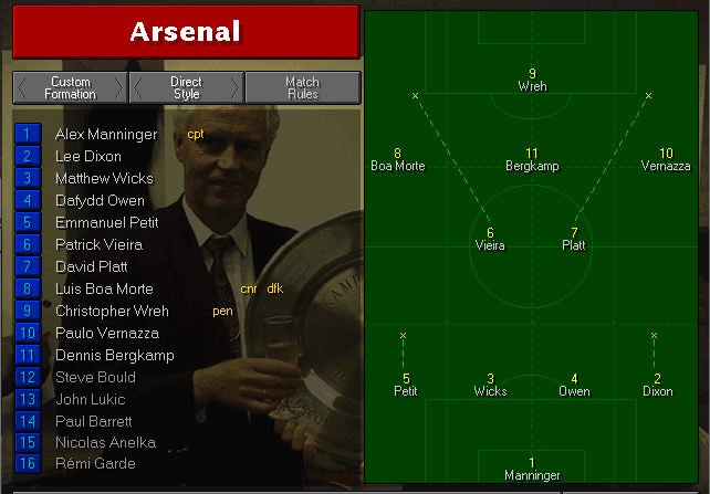 This one was a little more even than the rest of our games so far. It was a weird game for Ian Wright, who had 3 opportunities and he wasn’t able to net neither of them. Therefore, I felt it was time to give Anelka some playing time (also in came Ray Parlour for Vernazza and Barrett for Garde).