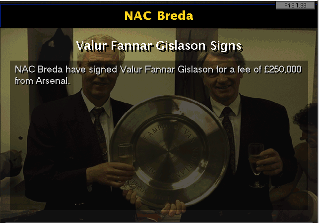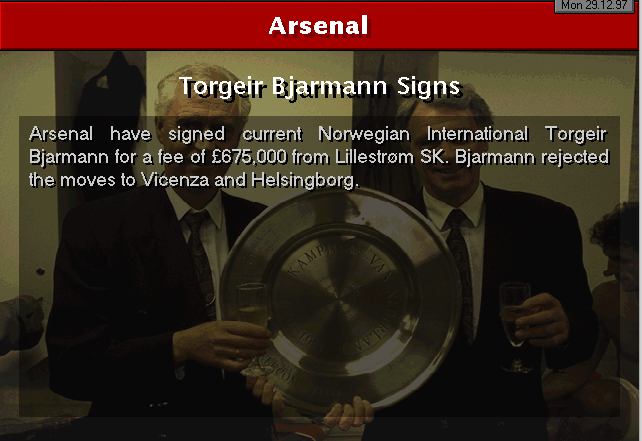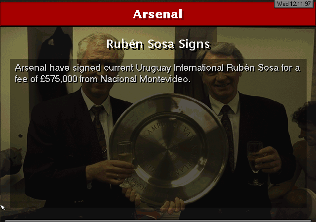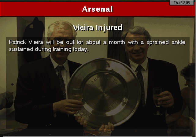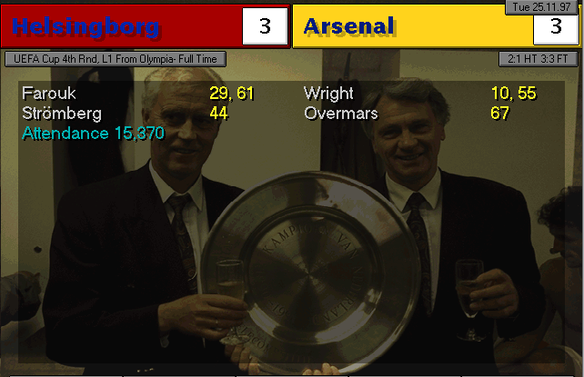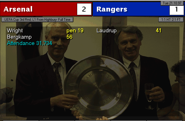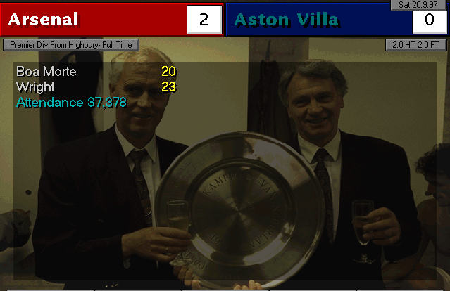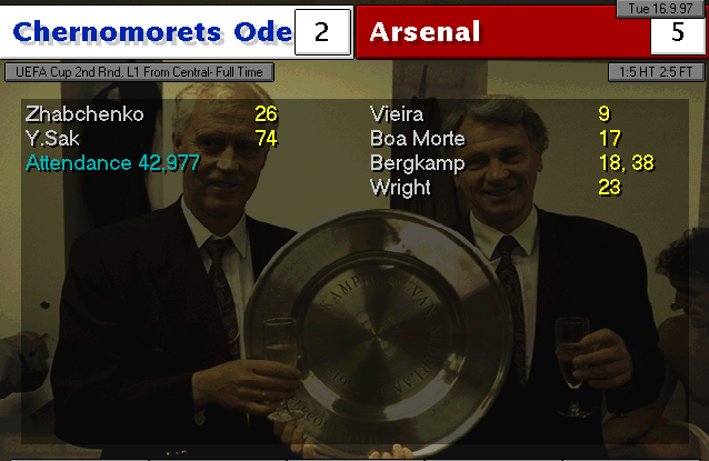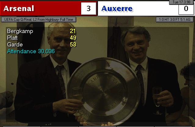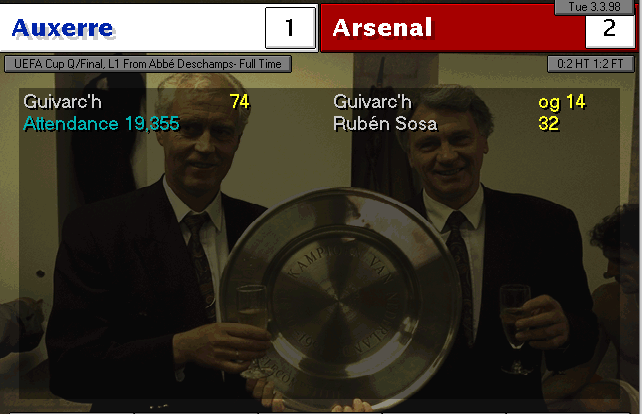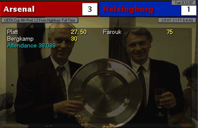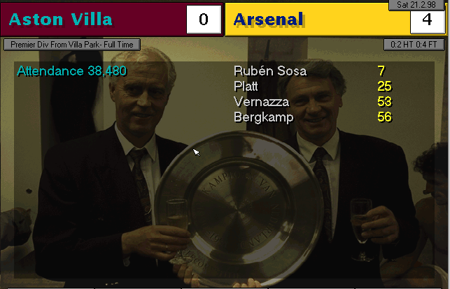 Aston Villa are put to the sword on their backyard. Ruben Sosa and Platt gave the early lead into halftime. Vernazza (who I subbed in for Overmars) and Bergkamp placed the icing on the cake to round up 4 goals.