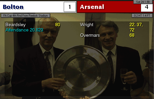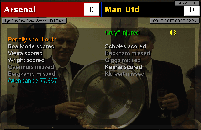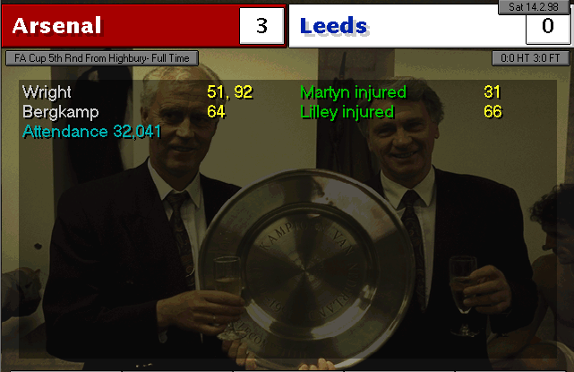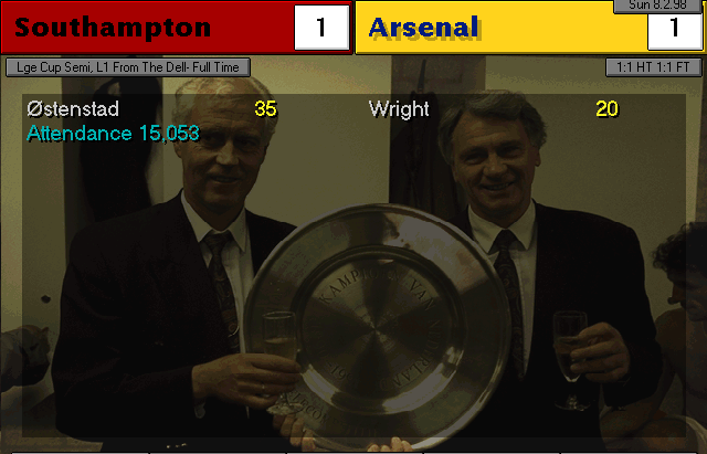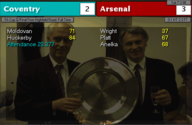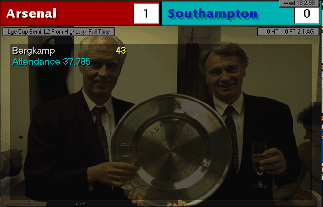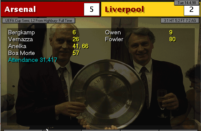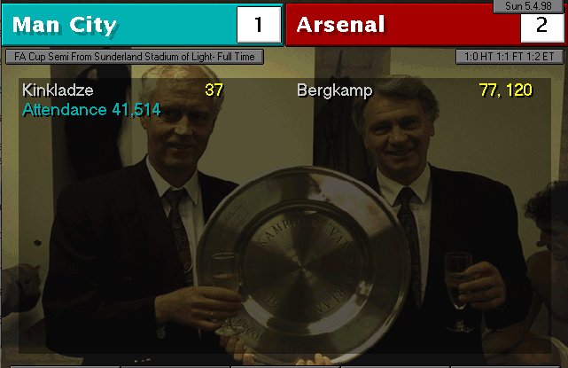 Nerve-wracking game. Weaver and Vaughan were City’s best players, stopping us from winning in the first 90 minutes of the match. In the extra-time, when everything seemed headed for a replay, Bergkamp took charge and with a header, gave us the elusive win. In the other semifinal, Manchester United disposed of Liverpool by thrashing them 4-0, which means we will meet again and also for a final.