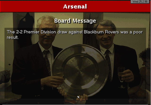 We edged Blackburn by halftime with Ruben Sosa scoring a penalty and Tim Flowers being sent off. Nevertheless, they fought back and managed to draw the game. A bit of a poor performance but we still hold a decent advantage against the 2nd placed team in Premier League.